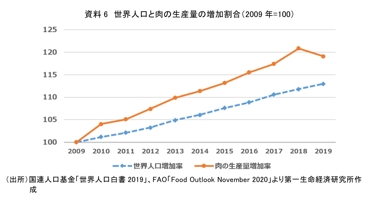 プラントベース,ヴィーガン下記は、世界人口と肉の生産増加割合を示したグラフです。(出典:日本生命経済研究所)世界人口の増加に伴い、肉の生産量も比例して増加しています。